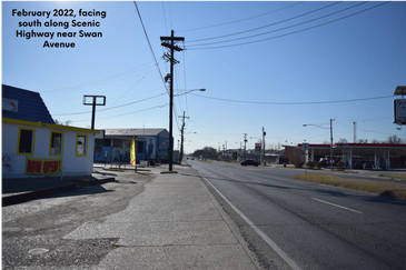 This project proposes roadway enhancements within the existing Right-of-Way including drainage improvements, pedestrian and bicyclist accommodations, and green infrastructure. Scenic Highway is also US 61 and has 2 travel lanes in each direction, numerous median openings, non-ADA compliant sidewalks, and unplanned signed transit stops alo